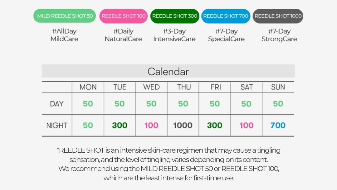 Tämän jälkeen kasvoille voi käyttää normaaliin tapaan muut ihonhoitotuotteet, kuten kasvovedet, seerumit ja voiteet. VT Reedle Shot 100 auttaa ihonhoitotuotteita imeytymään iholle paremmin. Näin niiden vaikutus on myös parempi. Voit tehostaa seerumin vaikutusta käyttämällä siitä eri vahvuuksia vaihdellen. Se onnistuu seuraavalla tavalla: 50 ja 100 on tarkoitettu jokapäiväseen käyttöön. Reedle Shot 50 on tarkoitettu päivä käyttöön ja sen parina voi käyttää muita vahvuuksia iltarutiinissa. Esimerkiksi 50 aamulla ja 100 illalla. 300 on tarkoitettu käytettäväksi 3 päivän välein eli käytännössä kahtena päivänä viikossa. 700 ja 1000 ovat voimakkaimpia vahvuuksia ja niitä voi käyttää vain kerran viikossa. Tässä alla vielä taulukko havainnollistamaan eri voimakkuuksien käyttöä samaan aikaan viikon eri päivinä.